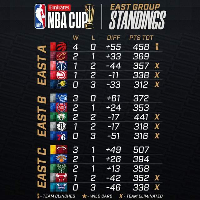另一組熱火這邊3勝1負暫時排在第一,尼克斯和雄鹿都是2勝1負,最后一輪兩隊直接對話,雄鹿贏球只能第二去爭奪外卡資格,尼克斯贏球則是小組第一。此外,本組的公牛與黃蜂均已淘汰。